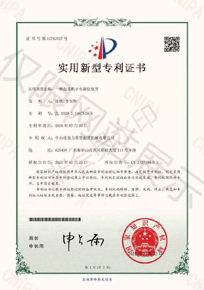 實用新型專利證書 -- 起重機小車限位裝置