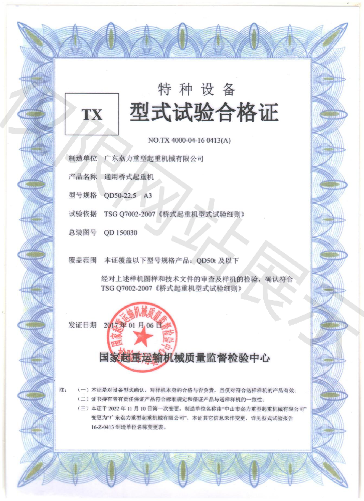 特種TX型式試驗(yàn)合格證--通用橋式起重機(jī)