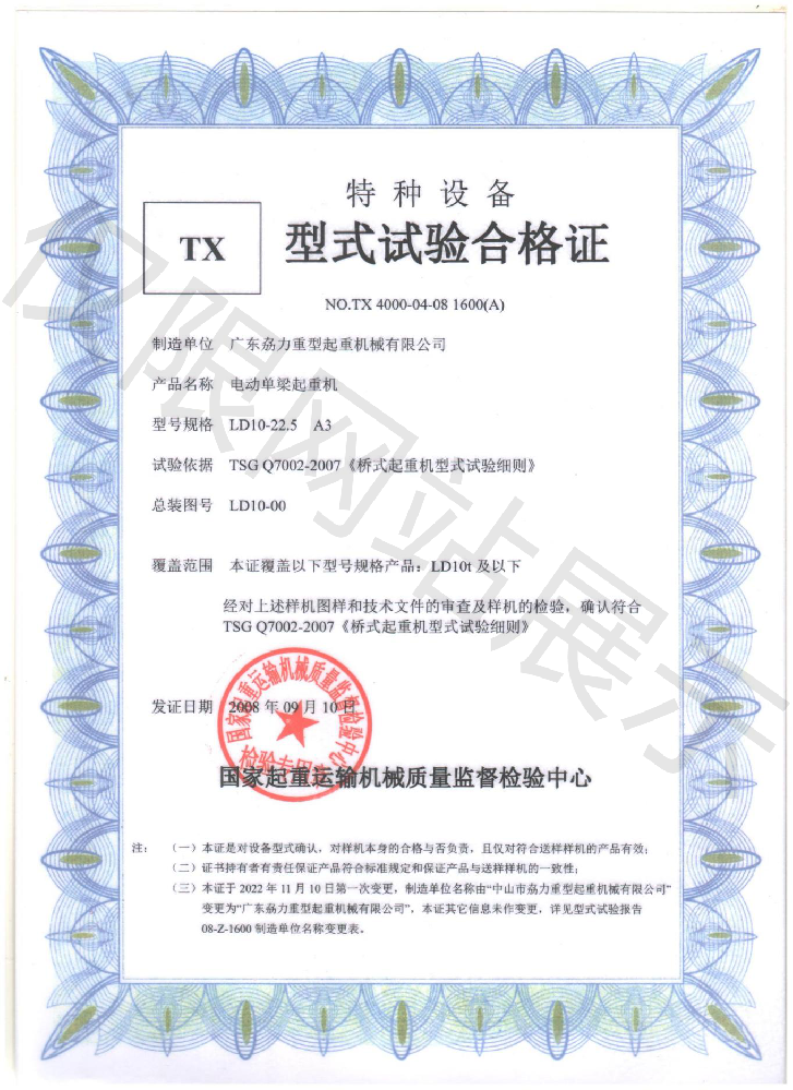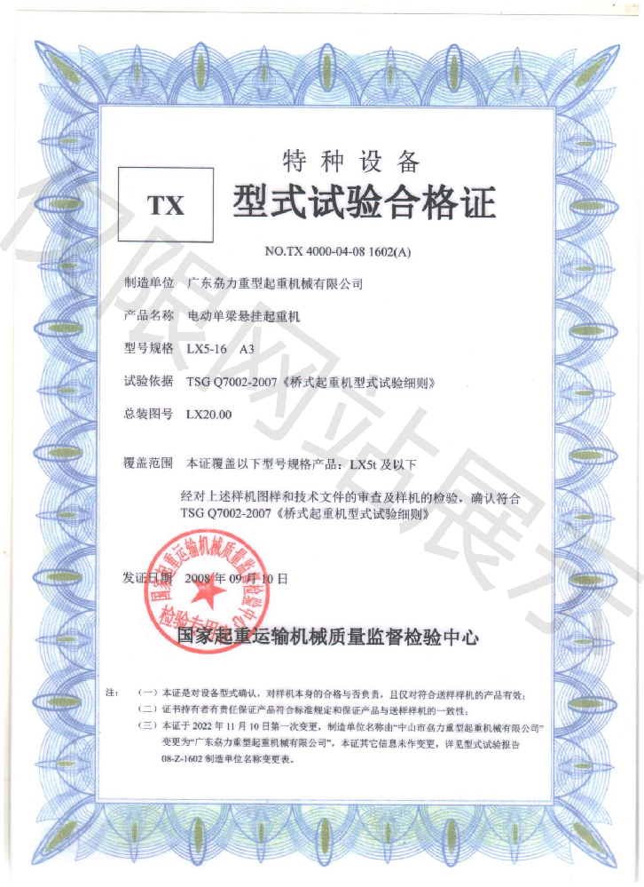特種TX型式試驗(yàn)合格證--電動(dòng)單梁懸掛起重機(jī)